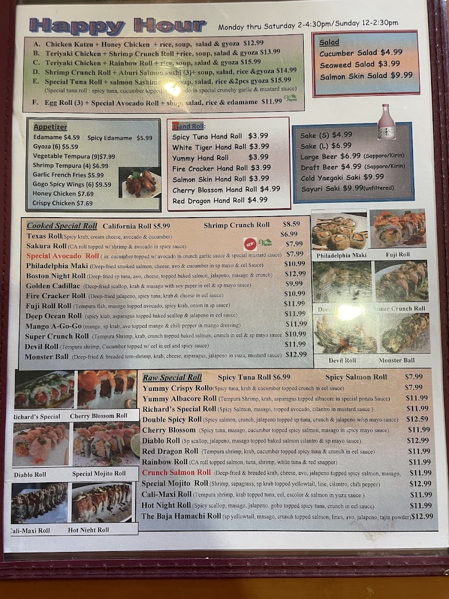 Spicy scallop, gobo, masago, cucumber and jalapeño topped w/ spicy tuna, avocado, crunch in eel sauce.
