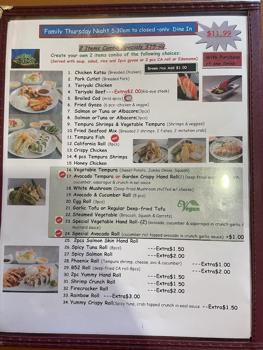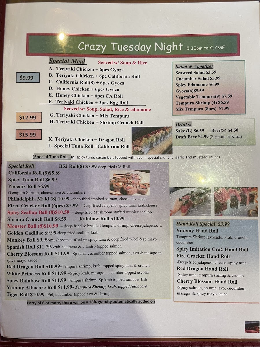 3 tuna, 3 salmon, 2 yellowtail, 2 white tuna, 2 albacore, 2 red snapper, 1 sweet shrimp and 4 squid rolls. Served with soup, salad and rice or edamame.