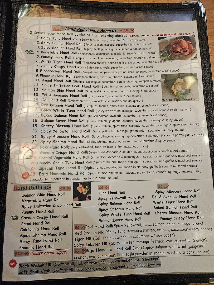 Choose 3: Tuna, Yellowtail, Salmon, Spicy Tuna, Spicy Salmon, Spicy Scallop, Red Snapper, Spicy Imitation Crab, Squid, Albacore, Octopus, Shrimp, White Tuna, or Tempura Shrimp