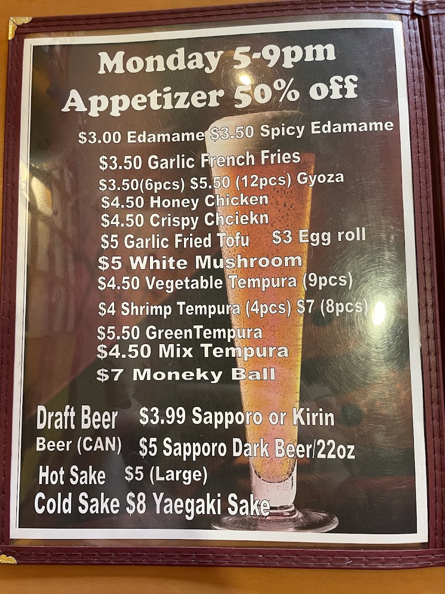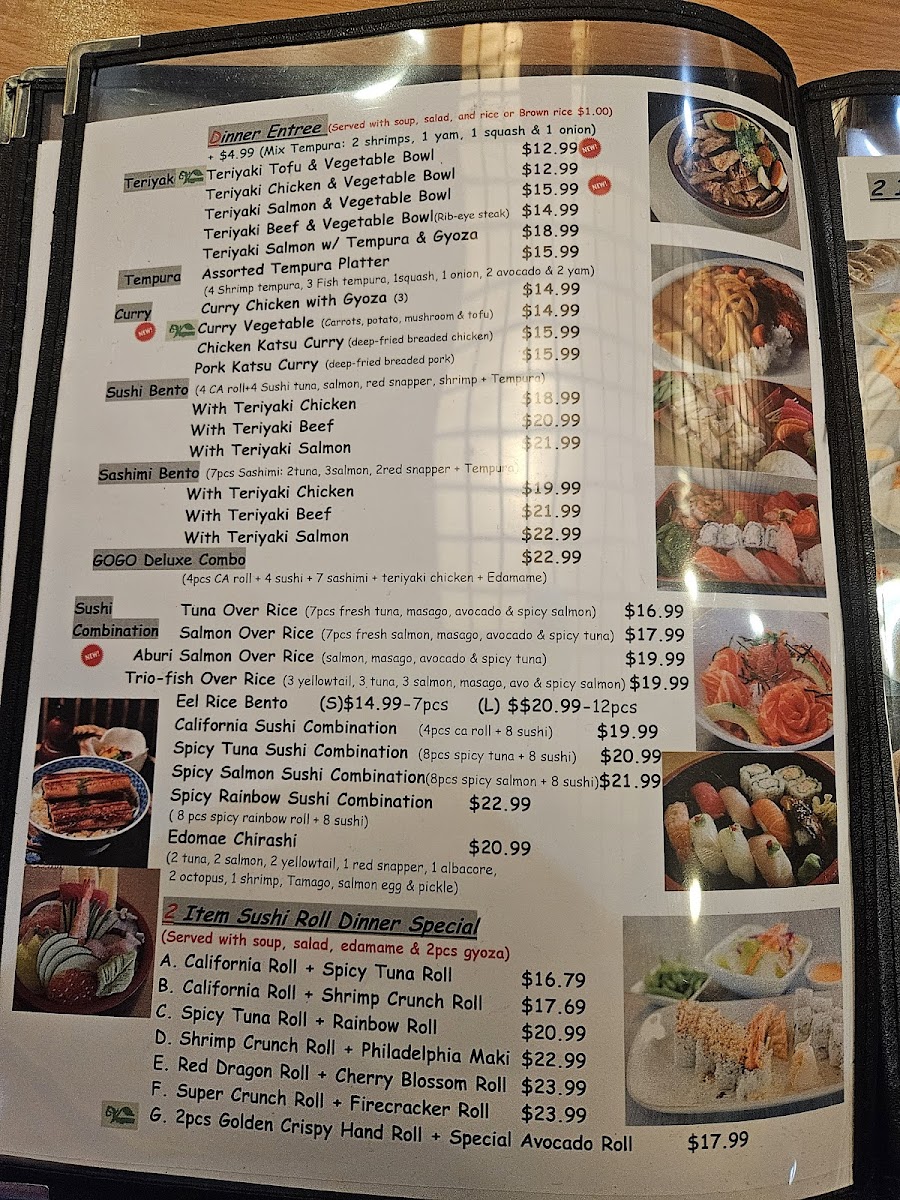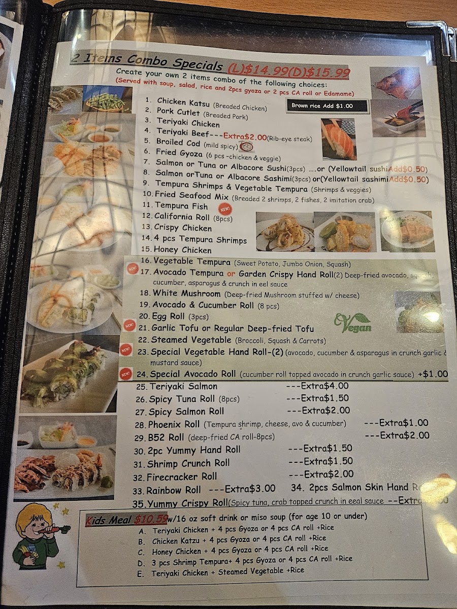 3 pieces shrimp tempura and 4 pieces of gyoza or 4 pieces of California roll and rice.